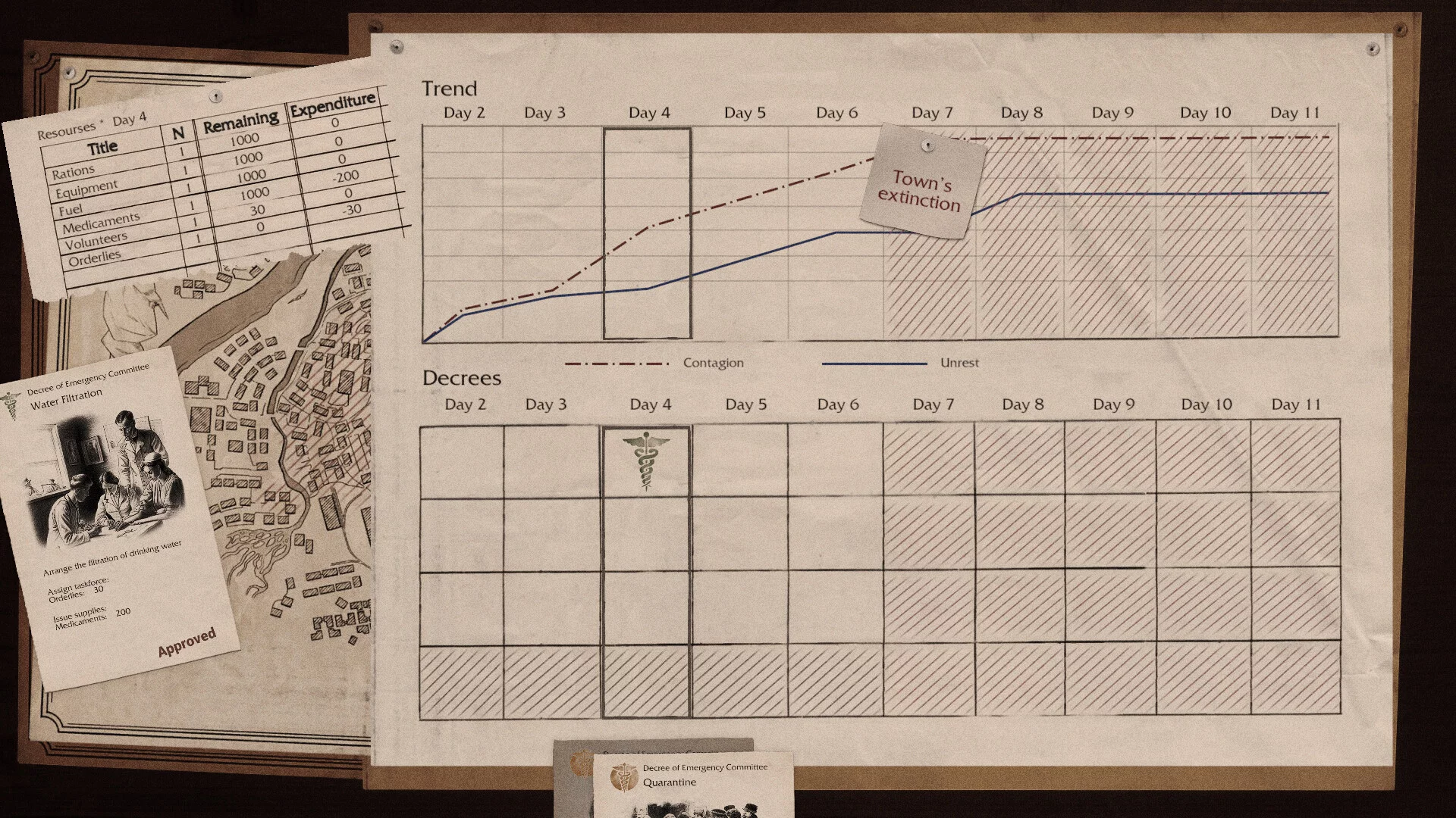 Управление городом и моральные выборы: помимо лечения отдельных людей, игрок принимает стратегические решения, влияющие на судьбу всего поселения. Необходимо вводить карантины, распределять ограниченные ресурсы, организовывать патрули, подавлять бунты и устанавливать комендантский час. Каждое действие имеет последствия: жёсткие меры могут спасти жизни, но спровоцировать ненависть жителей, а мягкость — привести к новой волне заражений. Игра намеренно ставит перед дилеммами, где нет однозначно правильных решений: например, конфискация лекарств у одних может дать шанс другим, а принудительная вакцинация — вызвать сопротивление. Результаты выборов трансформируют облик города, меняя его атмосферу от отчаянной борьбы до тотального хаоса.